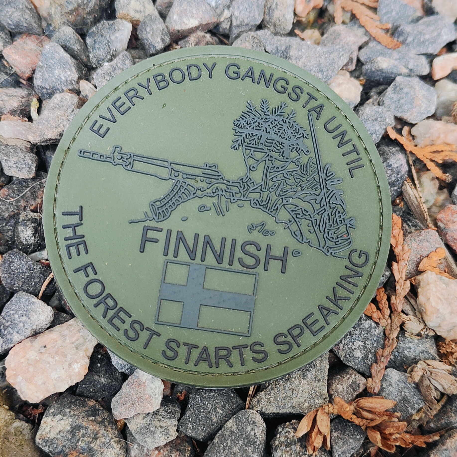 Meillä osataan ja meillä osataan myös olla ylpeitä osaamisesta. Joskus. Tämä merkki on toki kieli poskella suunniteltu, mutta siinä kiteytyy tunnetun 'everybody gangsta' -meemin avulla suomalaisten halu ja kyky puolustaa Suomen alueellista ja aatteellista koskemattomuutta.
